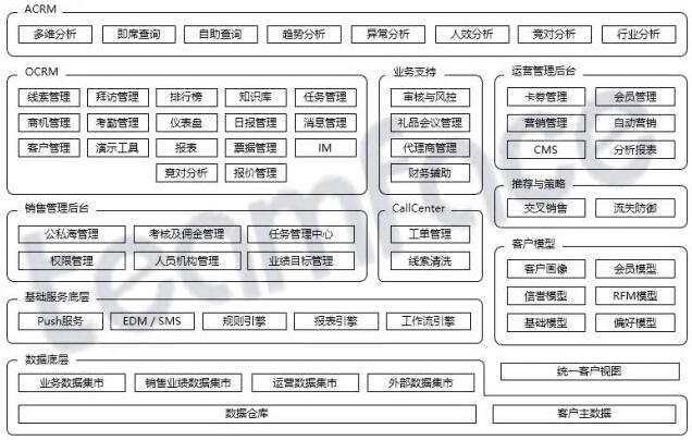 結合客戶開發、維護、服務的業務分工與職責定位,以及軟件架構設計的經典模式,整體CRM架構中包括以下幾大塊內容。